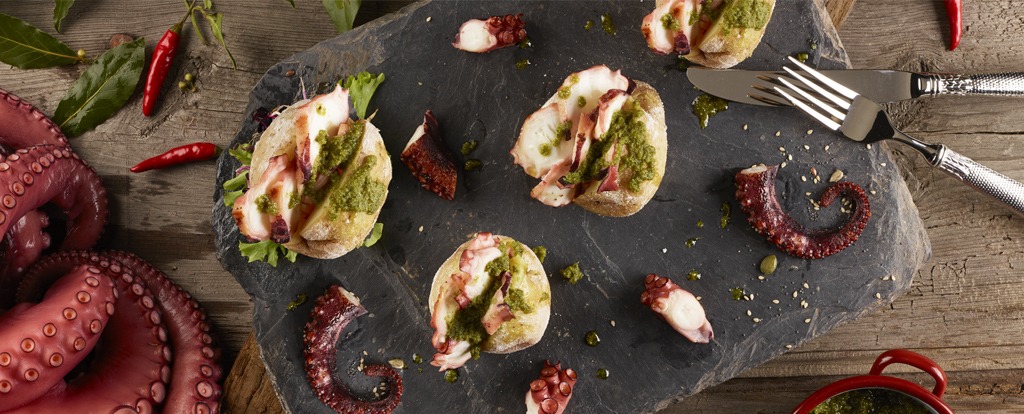 "Papas Arrugás" farcis au poulpe grillé et à la sauce mojo au basilic vert.