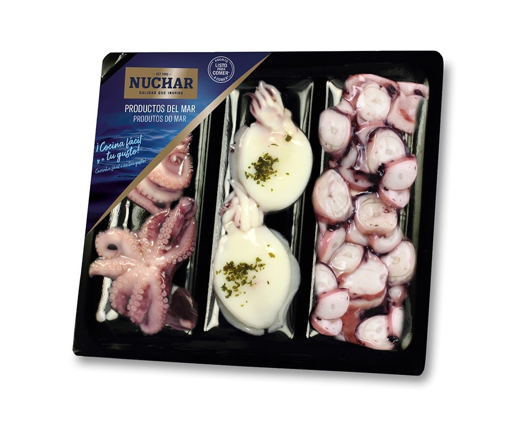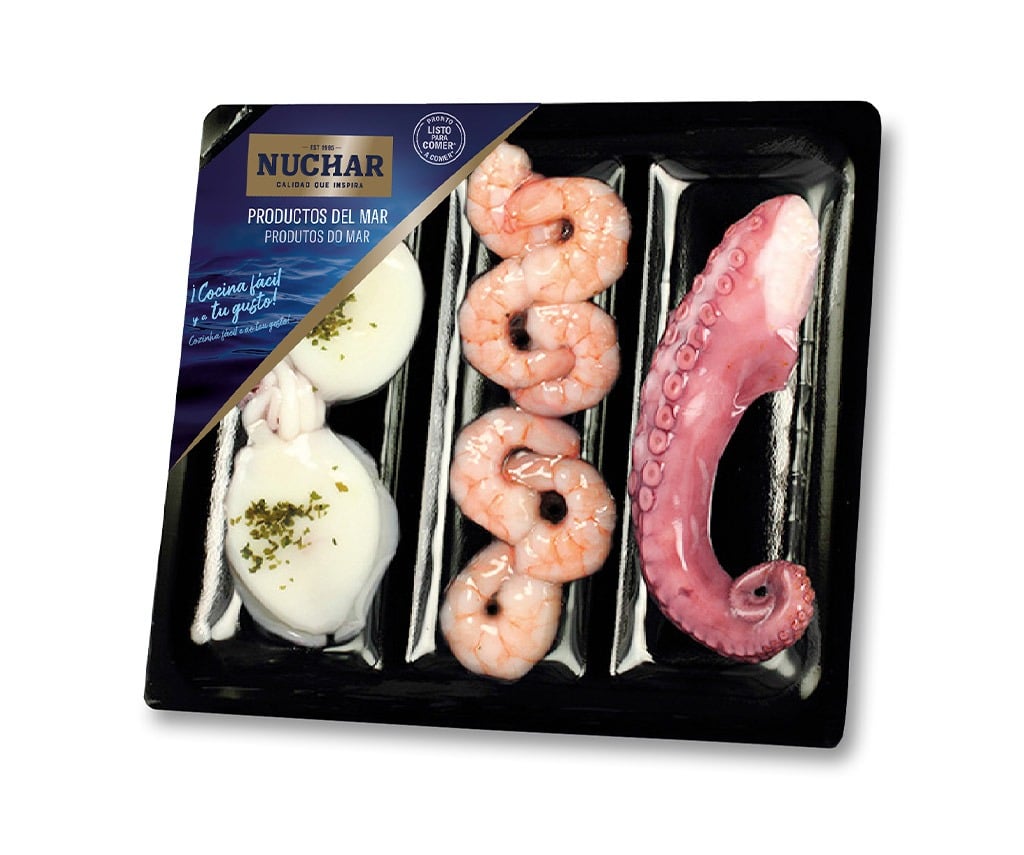 Una rica combinación de tres productos NUCHAR. Pulpo, langostinos y mejillones.