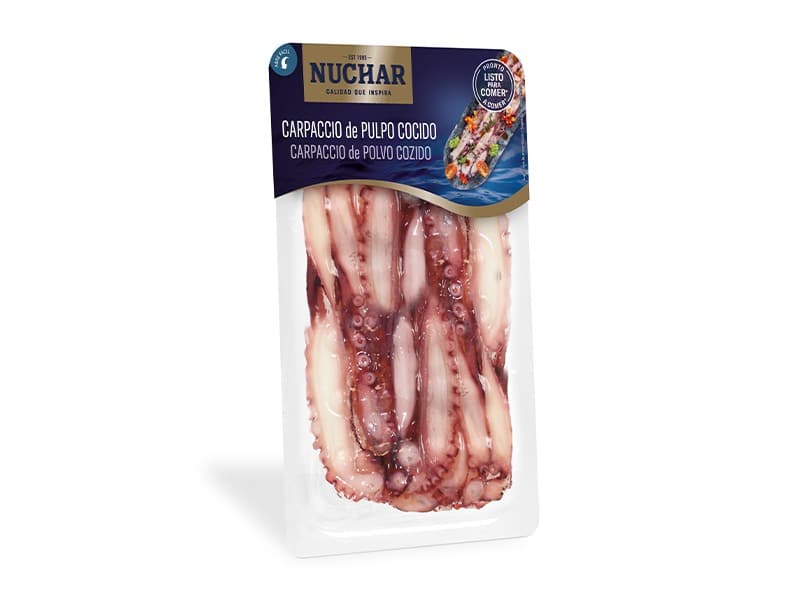 Abrir el envase y quitar completamente el film protector. Darle la vuelta y empujar el carpaccio para quitar la bandeja.