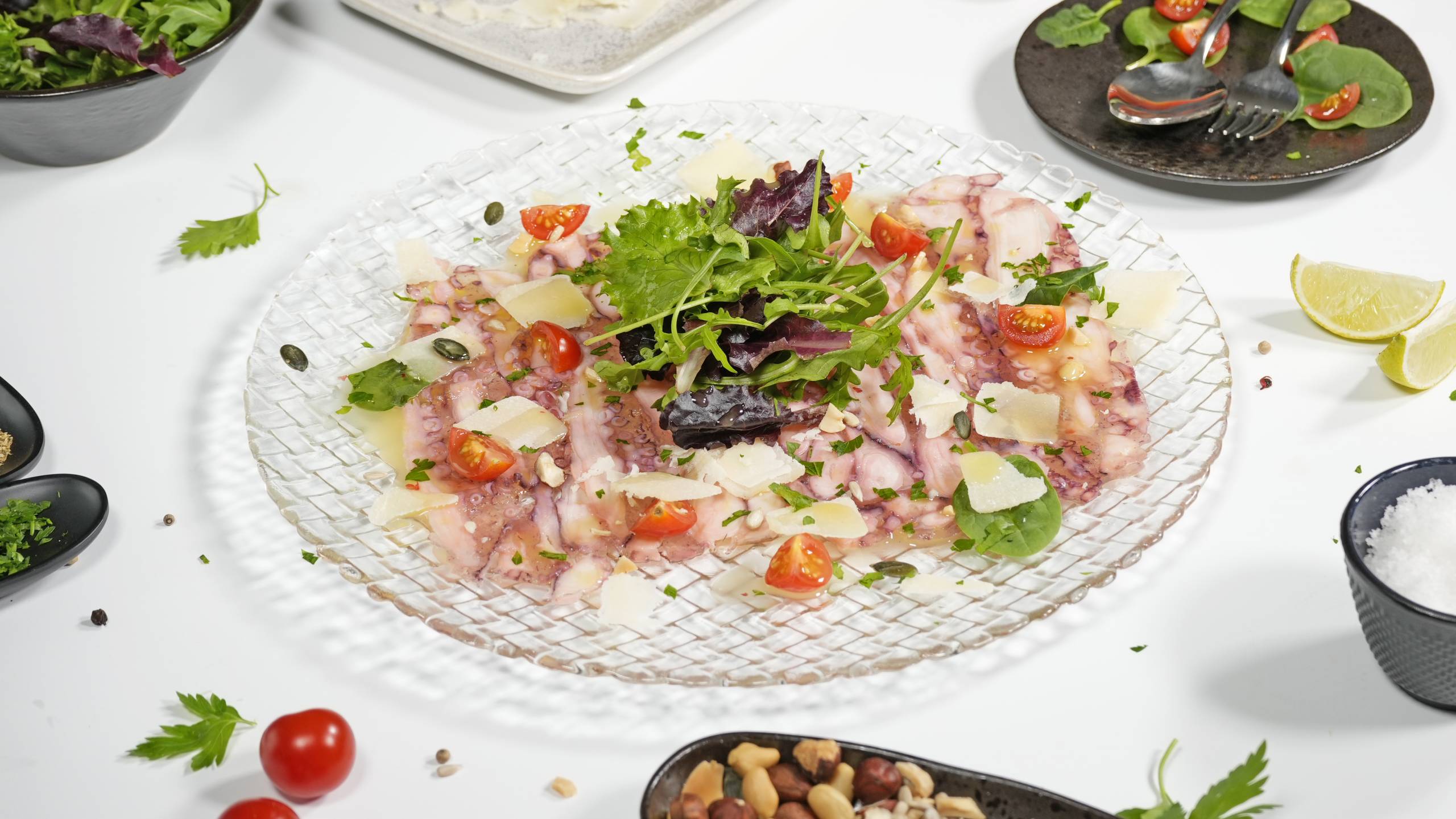 Añadir la mitad de la salsa al carpaccio y tapar con un film. Reservar hasta la hora de emplatar. Es recomendable que esté unos 30m para que el pulpo se impregne de todo el sabor de la vinagreta.