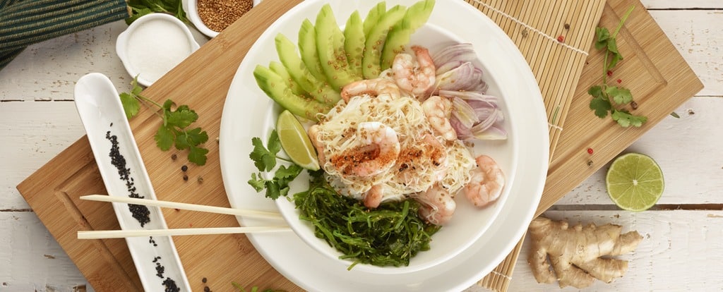 Cocer los fideos durante 2 minutos en agua hirviendo, sacar y refrescar en agua fría. Mezclar los fideos con los langostinos, el pepino, el wakame y la chalota con el aliño.